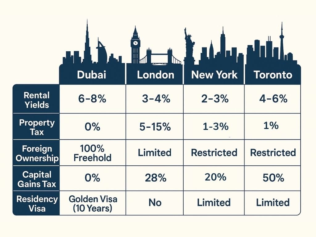 Dubai, UAE – Dubai’s real estate market has solidified itself as a premier investment destination in 2025, frequently outshining traditional global property hubs such as London, New York, and Toronto. This analysis explores key metrics such as rental yields, property taxes, foreign ownership regulations, capital gains taxation, and residency visa prospects to provide a comprehensive comparison for international investors, including a strong focus on Indian investors eyeing Dubai’s attractive market.