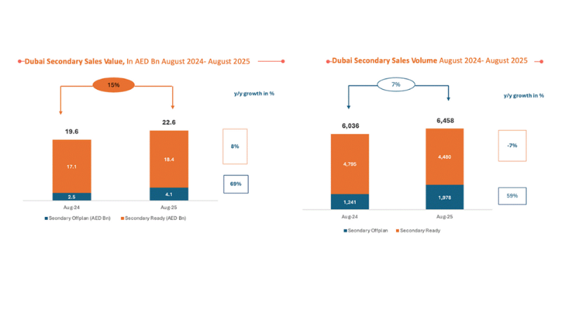 The surge was fuelled by a sharp increase in off-plan activity, where volumes jumped 25% and values rose 11% compared with August 2024. Secondary off-plan deals stood out, with 1,978 transactions worth AED 4.1 billion – up 59% in volume and 69% in value year-on-year.